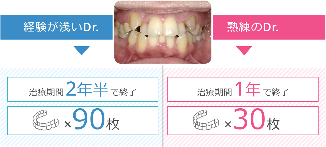 同じ症例でも、「人主導」なら治療期間を1年6カ月短縮でき、マウスピースの枚数も1/3で済みました。豊富な知識と経験を持つ歯科医師が担当すると、これだけの差が出るのです。当院では必ず、熟練の歯科医師が設計を担当するので、最短距離で矯正治療を完了できます。