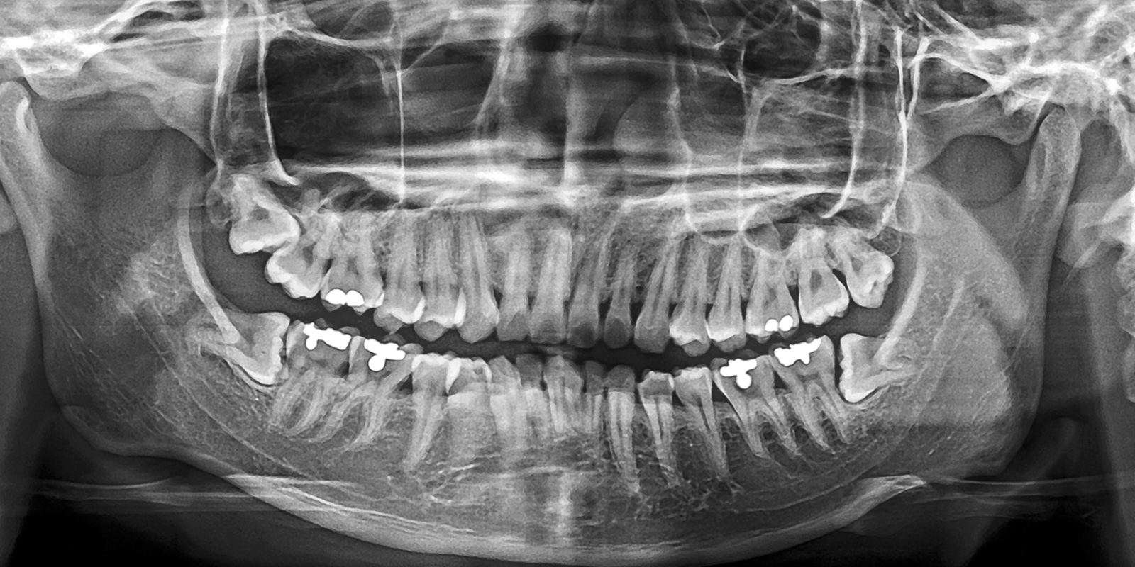 お口全体を1枚の画像で撮影できる、広範囲のレントゲン写真です。親知らずの位置や向き、周囲の歯との関係がひと目でわかります。