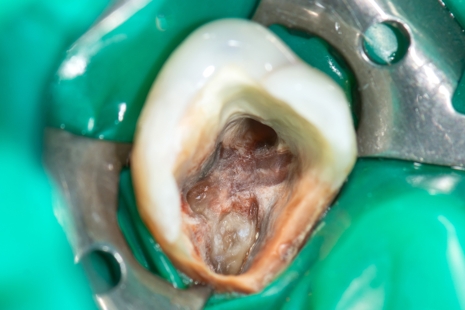 治療中に患部の歯だけを露出させ、唾液の侵入を防ぎながら安全に処置を進めています。再発リスクを減らすための大切な工程です。