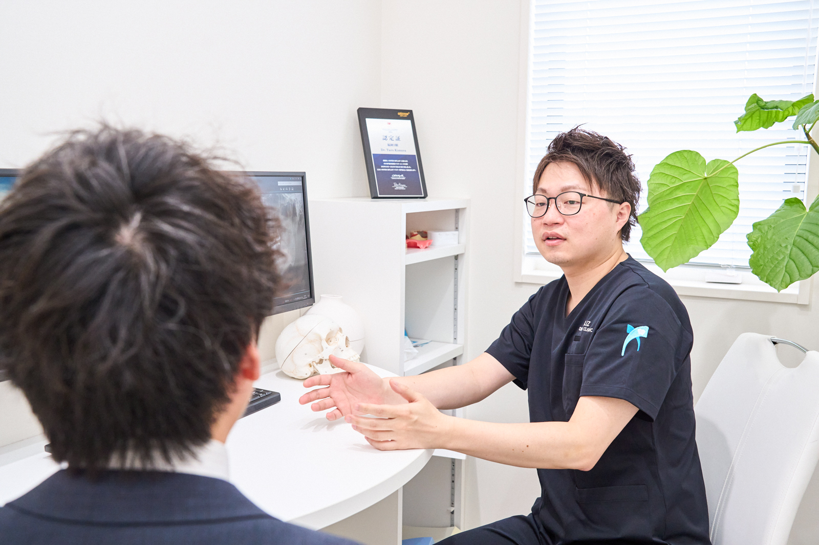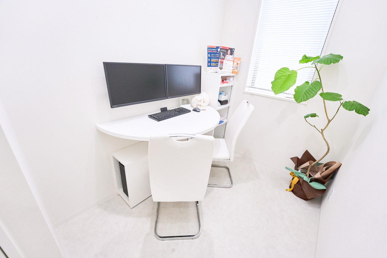 治療前のカウンセリングや治療内容のご説明に使用するスペースです。周囲から仕切られた空間にあるため、話し声が周囲に漏れることはございません。プライバシーは守られております。治療費や治療期間のことなど、不安なことは何でも気兼ねなくご相談ください。