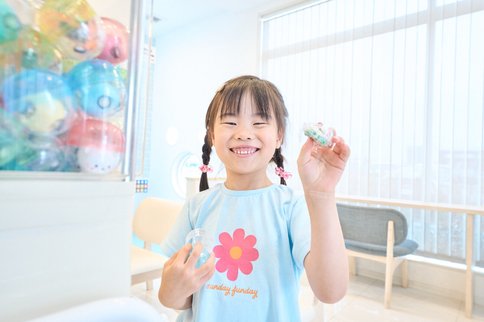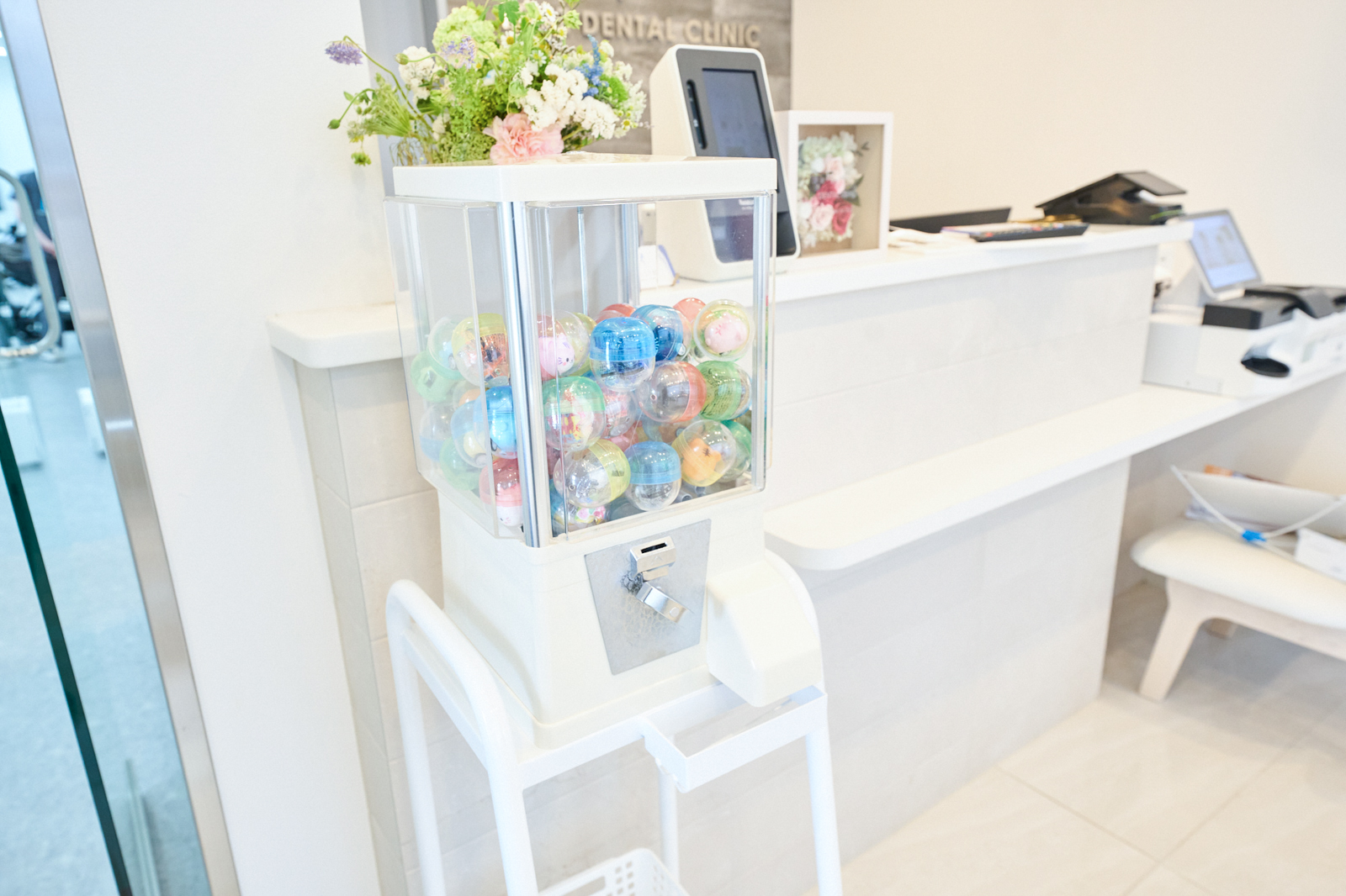 受付には、小さなお子さまが楽しめるガチャガチャコーナーもご用意しております。治療後のちょっとしたご褒美として、お子さまにも笑顔でお帰りいただける工夫をしております。