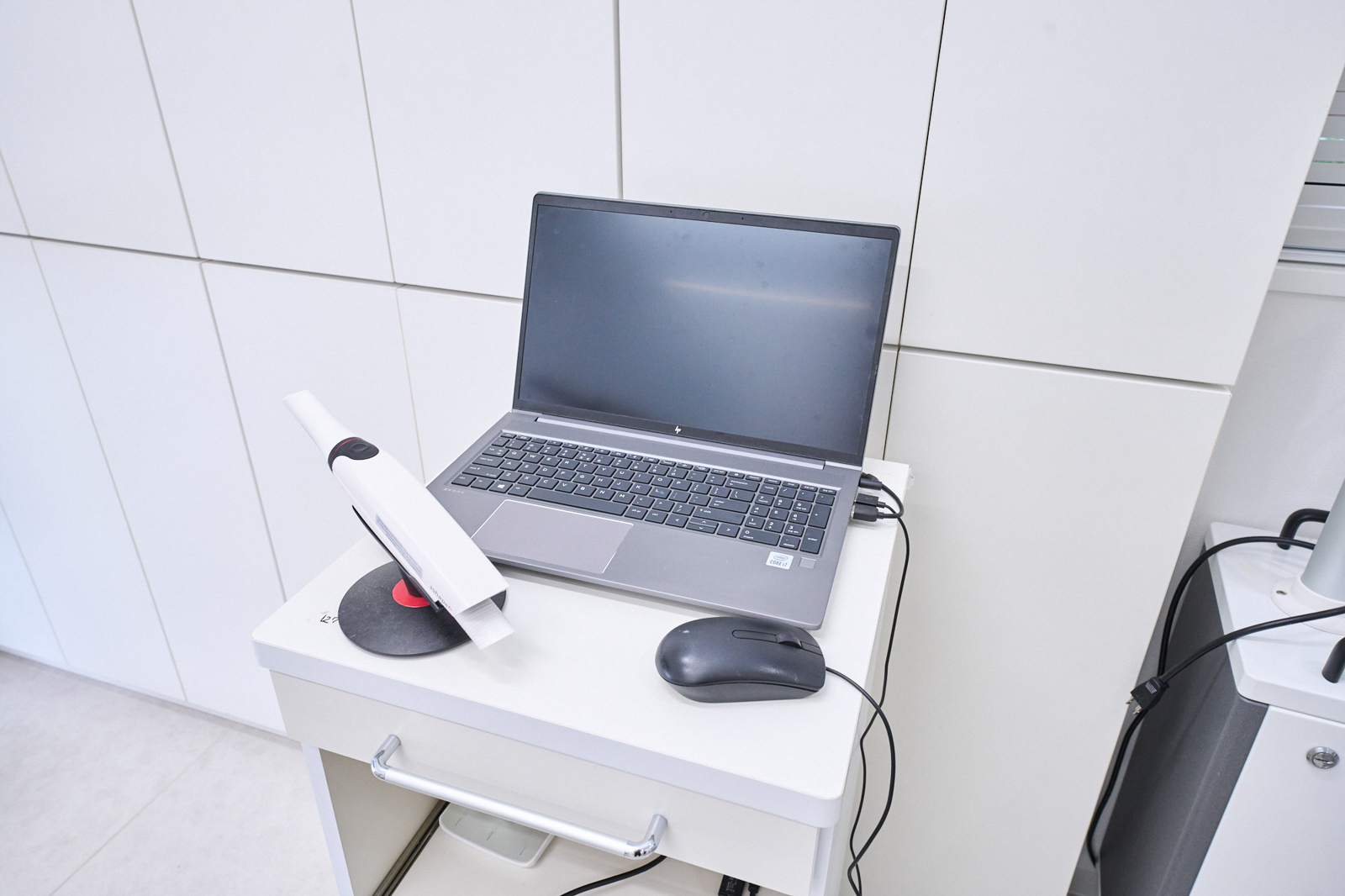 最先端の光学口腔スキャナーです。従来は口の中にシリコン材などを入れて歯型を採っていましたが、もう必要ありません。こちらの機器で口腔内をスキャンするだけで、正確かつスピーディーに歯型を採取できます。