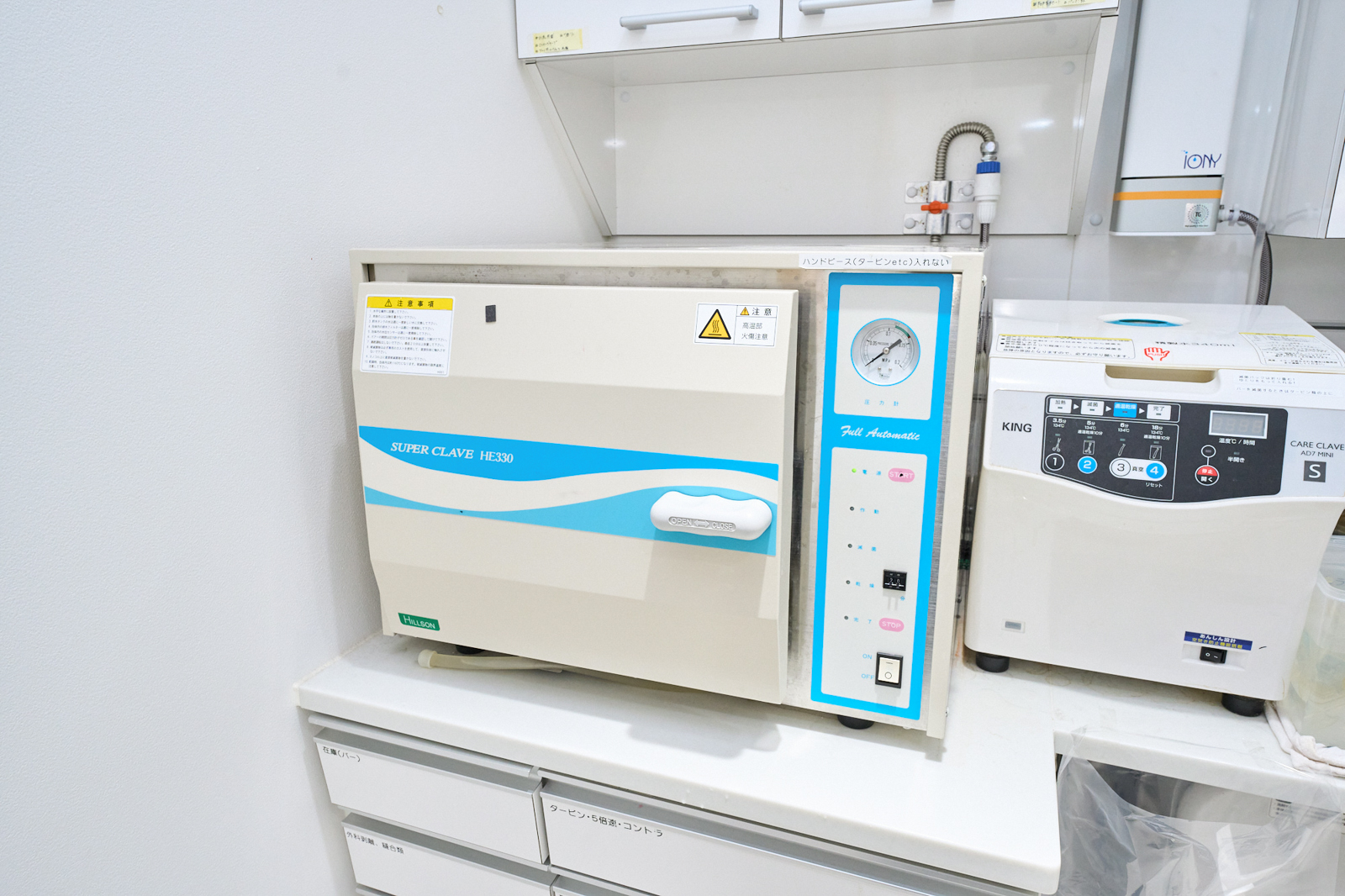 当院では、患者さまに安心して治療を受けていただけるよう、高水準の滅菌対策を徹底しております。治療に使用する器具はすべて、オートクレーブ(高圧蒸気滅菌器)を用いて、徹底した滅菌処理を行っています。