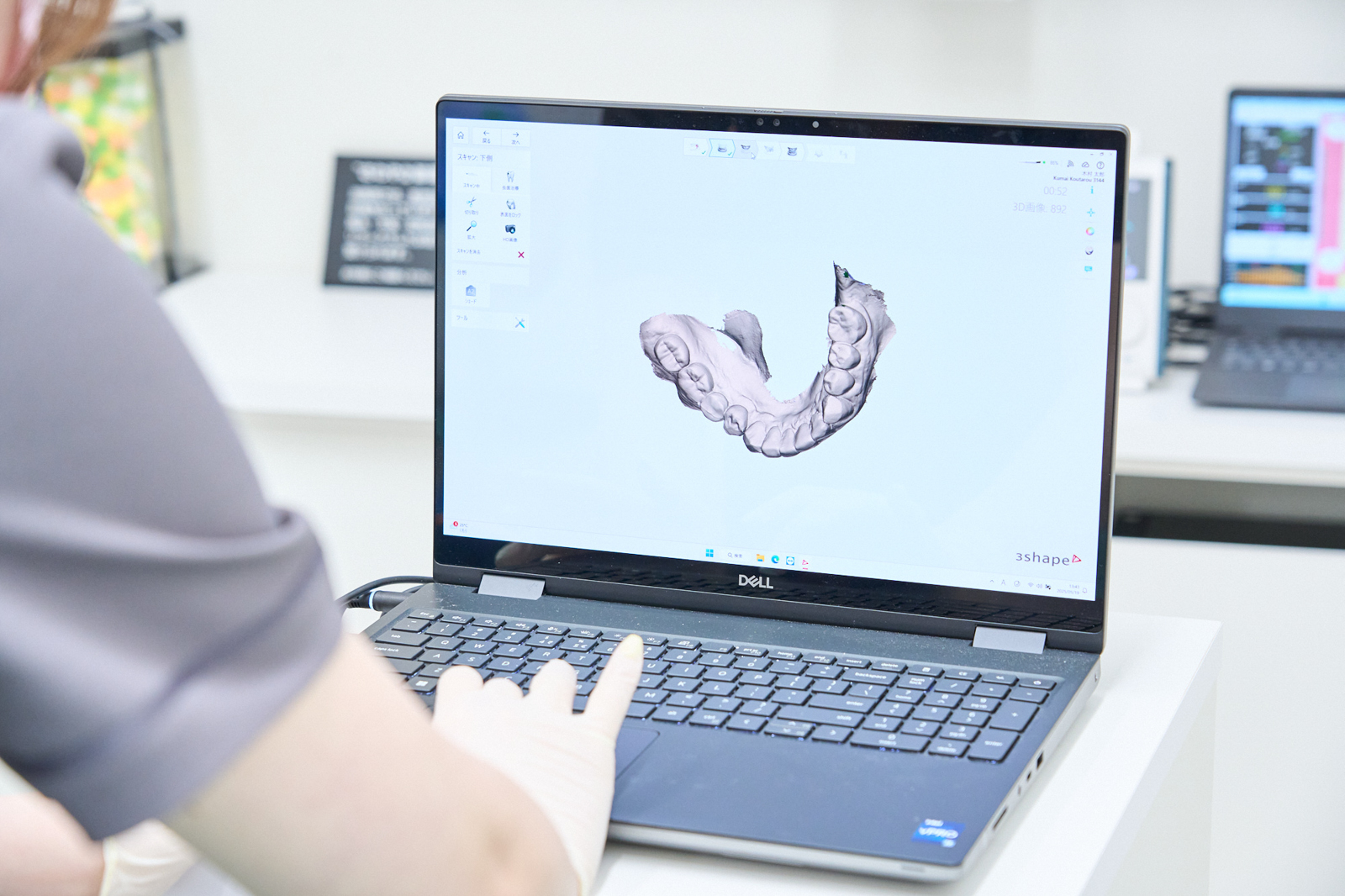 トリオスとは、お口の中を3Dスキャンし、立体的に読み取る機械です。この機械で読み取ったデータを基に矯正治療用のマウスピースを作成したり、詰め物・被せ物を作成していきます。