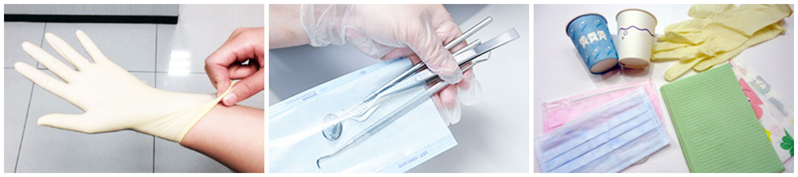当院では、滅菌、感染予防のためのマニュアルを構築し、誰が行っても高いレベルでの滅菌ができるよう体制を整えていますので、安心して治療に専念いただけます。エプロン、紙コップ、グローブはすべて使い捨てのものを利用しており、患者さんごとに交換しています。